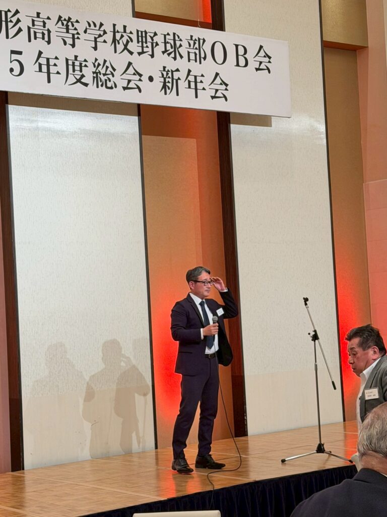 園田野球部部長、荒木監督よりご挨拶を頂いたのちに、新庄支部、上山支部より近況報告とスポーツOB会渡部副会長より告知、野球部保護者会より御礼のあいさつを頂きました。