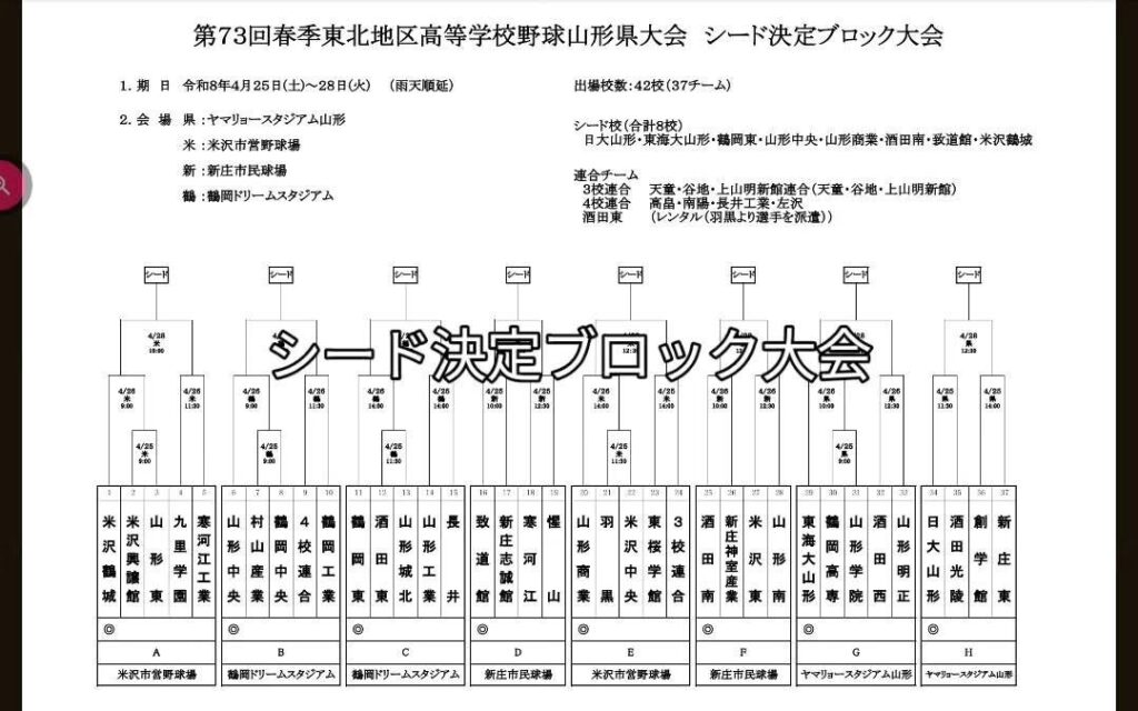 第73回春季東北地区高等学校野球山形県大会 シード決定ブロック大会組み合わせ